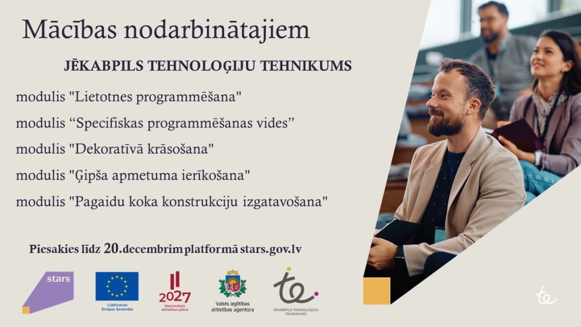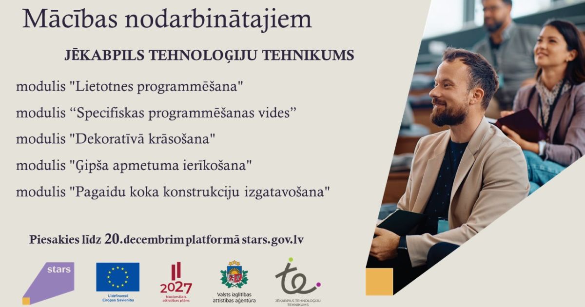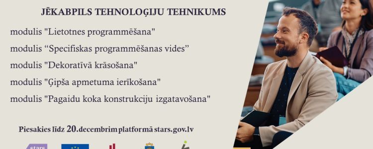Jēkabpils Tehnoloģiju tehnikums īsteno Eiropas Sociālā fonda Plus projektu Nr.4.2.4.2/1/24/I/001 “Atbalsts pieaugušo individuālajās vajadzībās balstītai pieaugušo izglītībai”