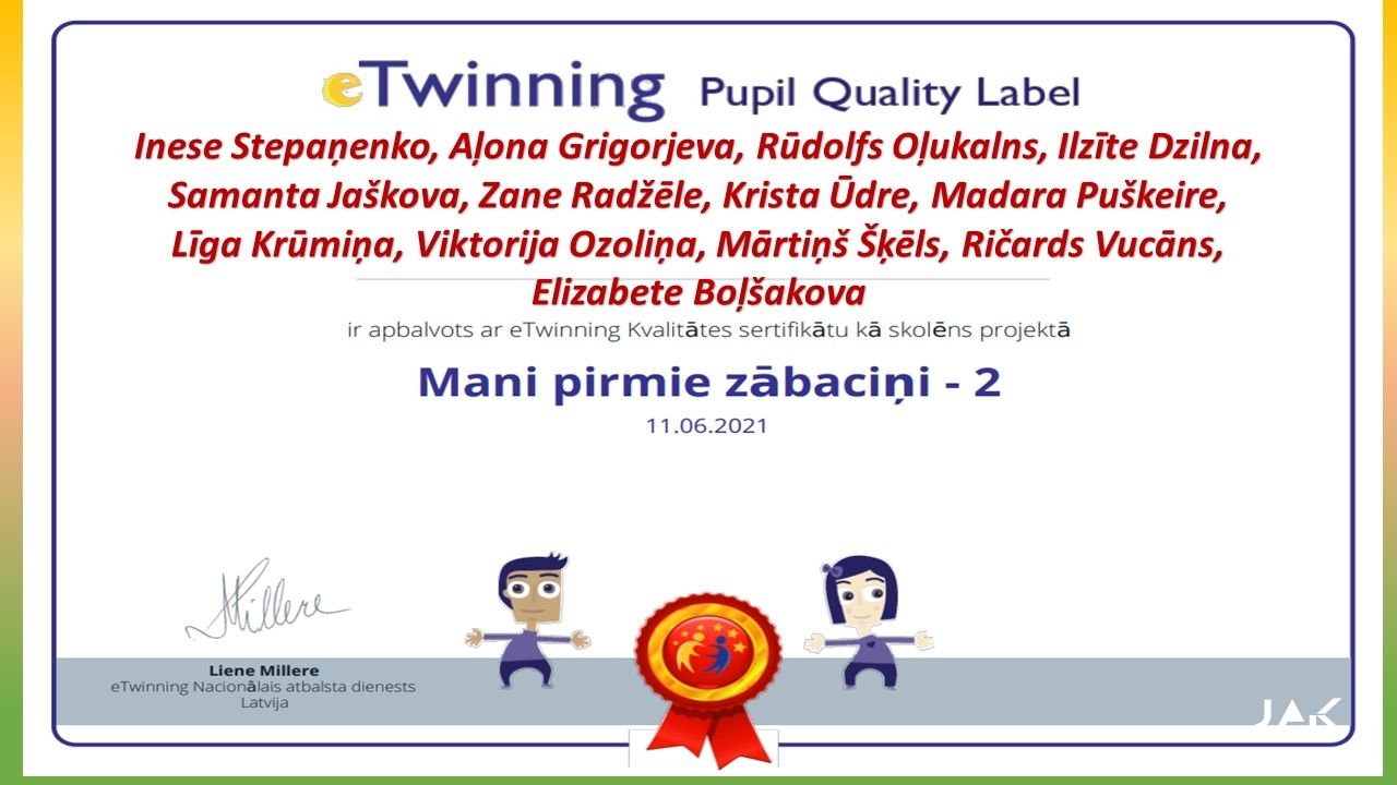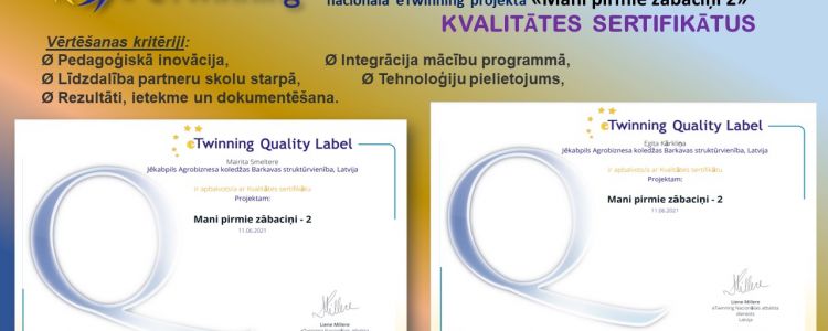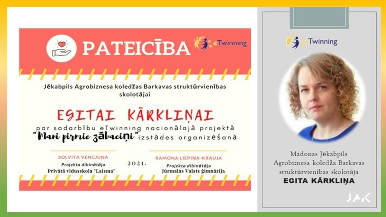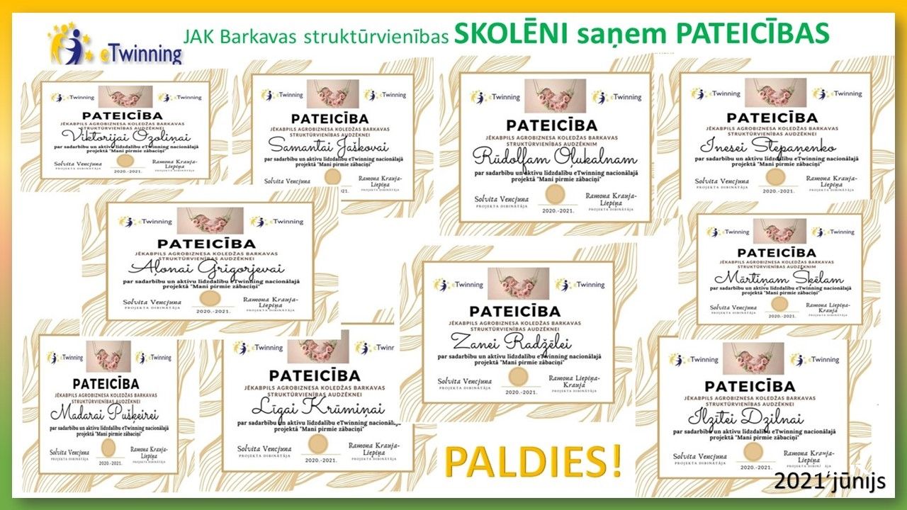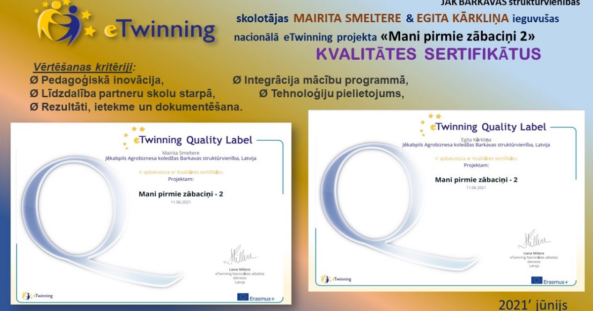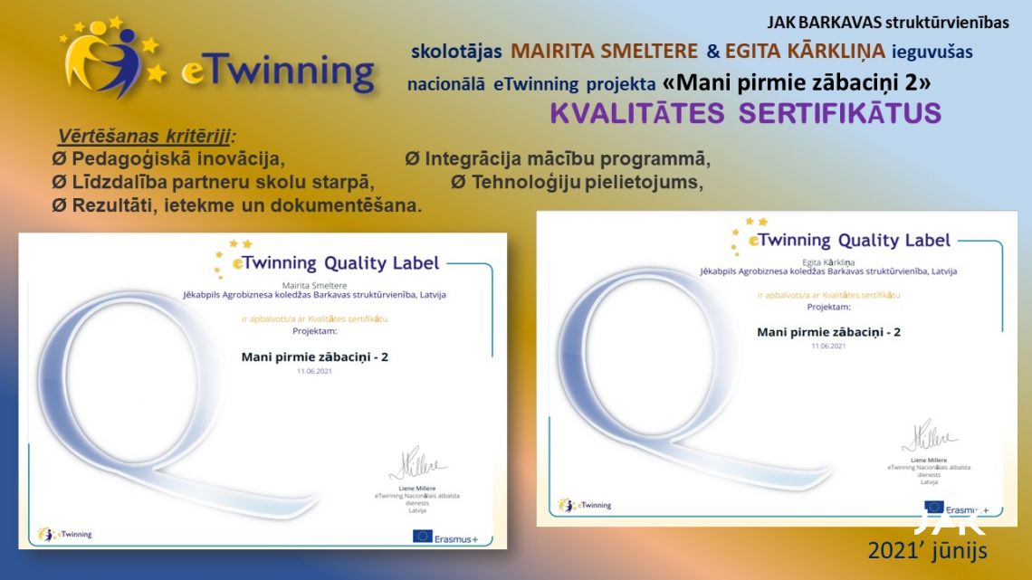 JAK BARKAVAS struktūrvienība ir gandarīti un priecīgi par saņemtajiem KVALITĀTES SERTIFIKĀTIEM nacionālajā eTwinning projektā “Mani pirmie zābaciņi 2”, kas tika saņemti 2021.gada jūnijā. Projektā darbojās skolotājas: Egita Kārkliņa & Mairita Smeltere un skolēni: Inese Stepaņenko, Aļona Grigorjeva, Līga Krūmiņa, Zane Radžēle, Izlīte Dzilna, Ričards Vucāns, Rūdolfs Oļukalns, Elizabete Boļšakova, Mārtiņs Šķēls, Viktorija Ozoliņa, Madara Puškeire, Krista Ūdre no dažādiem kursiem, katrs veicot dažādus uzdevumus.