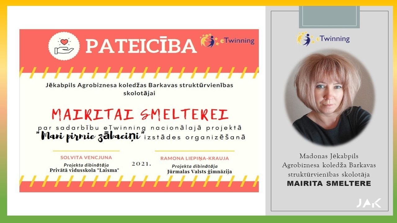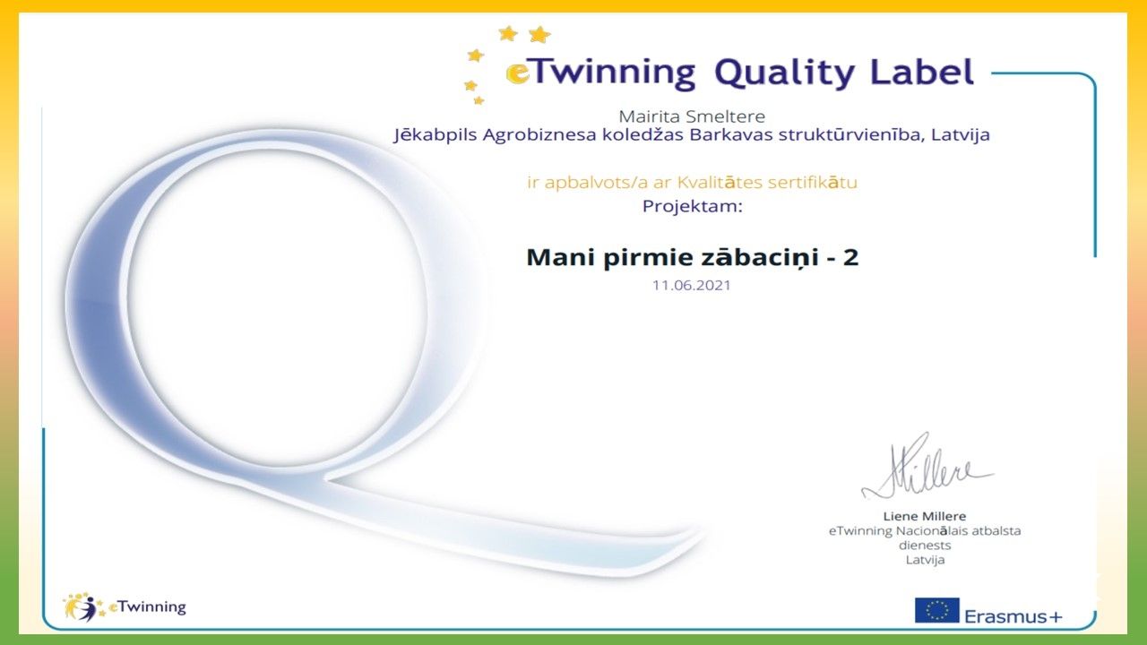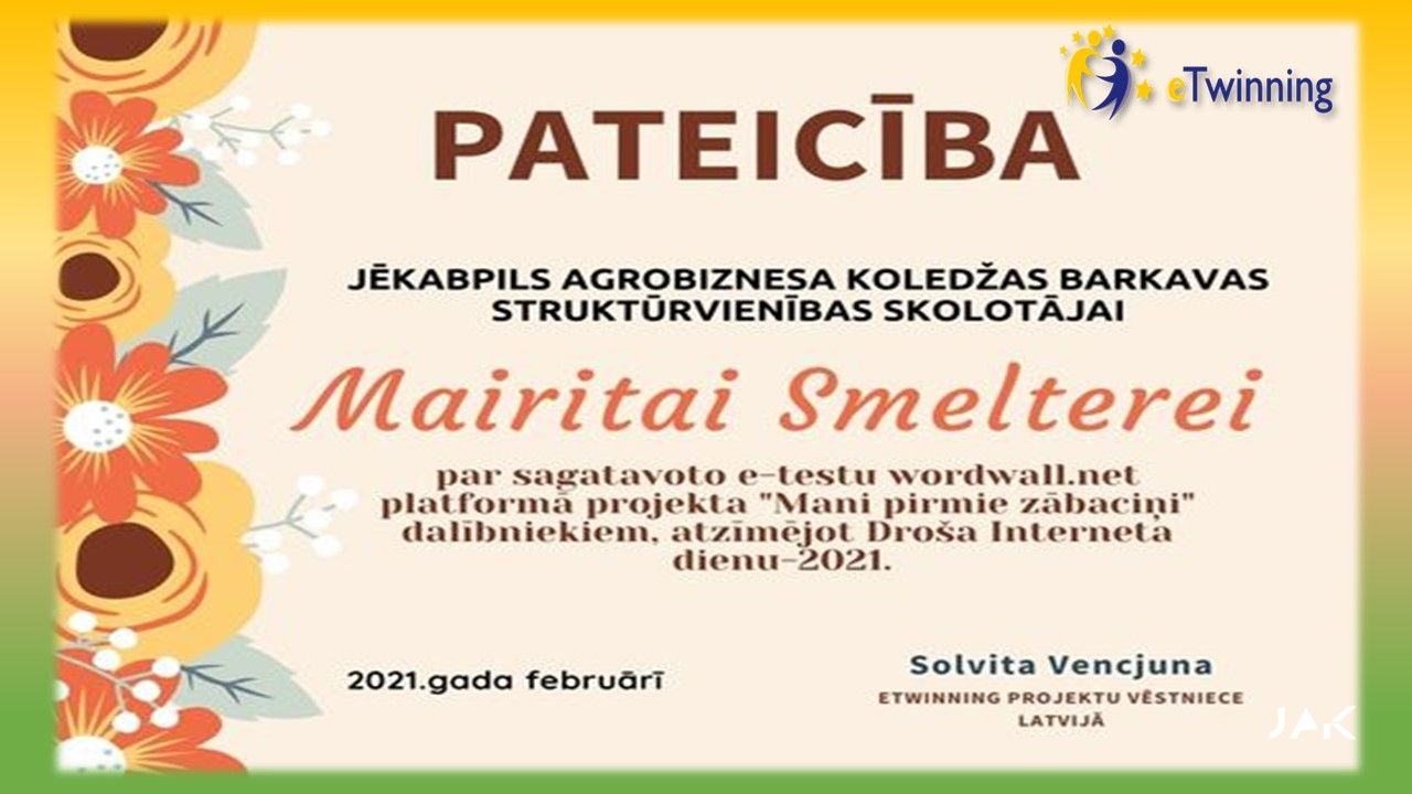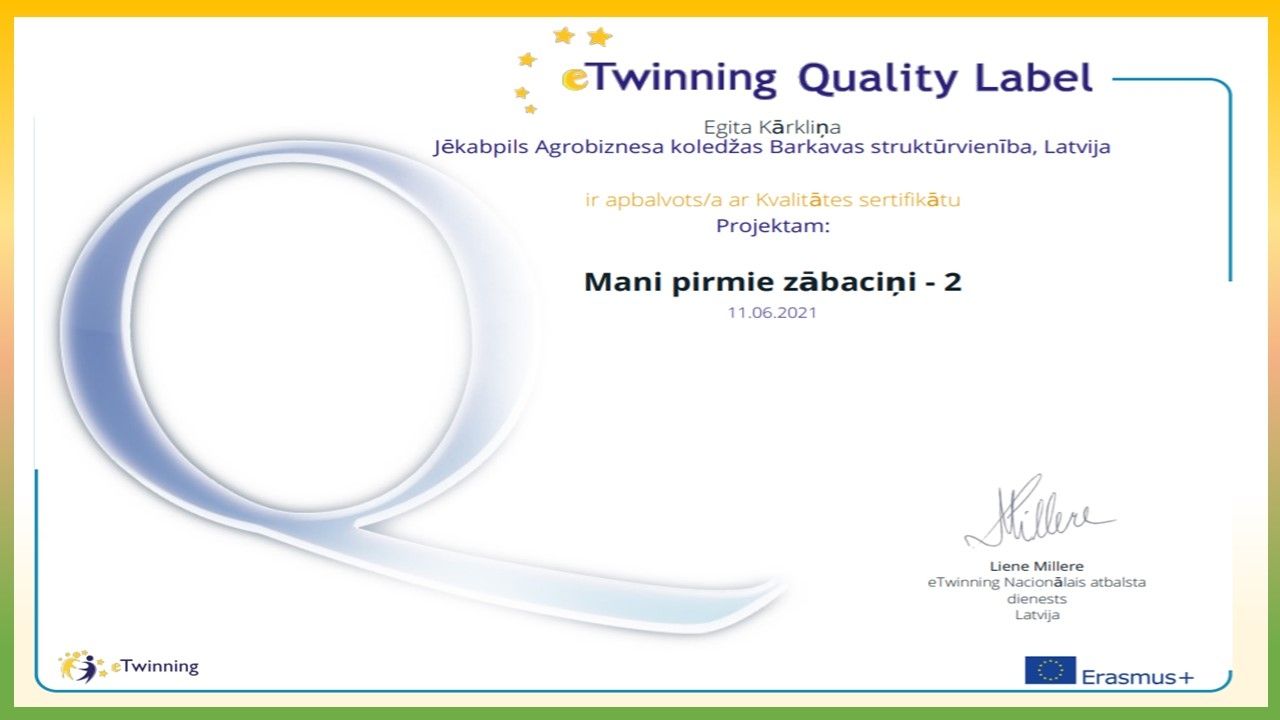 JAK BARKAVAS struktūrvienība ir gandarīti un priecīgi par saņemtajiem KVALITĀTES SERTIFIKĀTIEM nacionālajā eTwinning projektā “Mani pirmie zābaciņi 2”, kas tika saņemti 2021.gada jūnijā. Projektā darbojās skolotājas: Egita Kārkliņa & Mairita Smeltere un skolēni: Inese Stepaņenko, Aļona Grigorjeva, Līga Krūmiņa, Zane Radžēle, Izlīte Dzilna, Ričards Vucāns, Rūdolfs Oļukalns, Elizabete Boļšakova, Mārtiņs Šķēls, Viktorija Ozoliņa, Madara Puškeire, Krista Ūdre no dažādiem kursiem, katrs veicot dažādus uzdevumus.