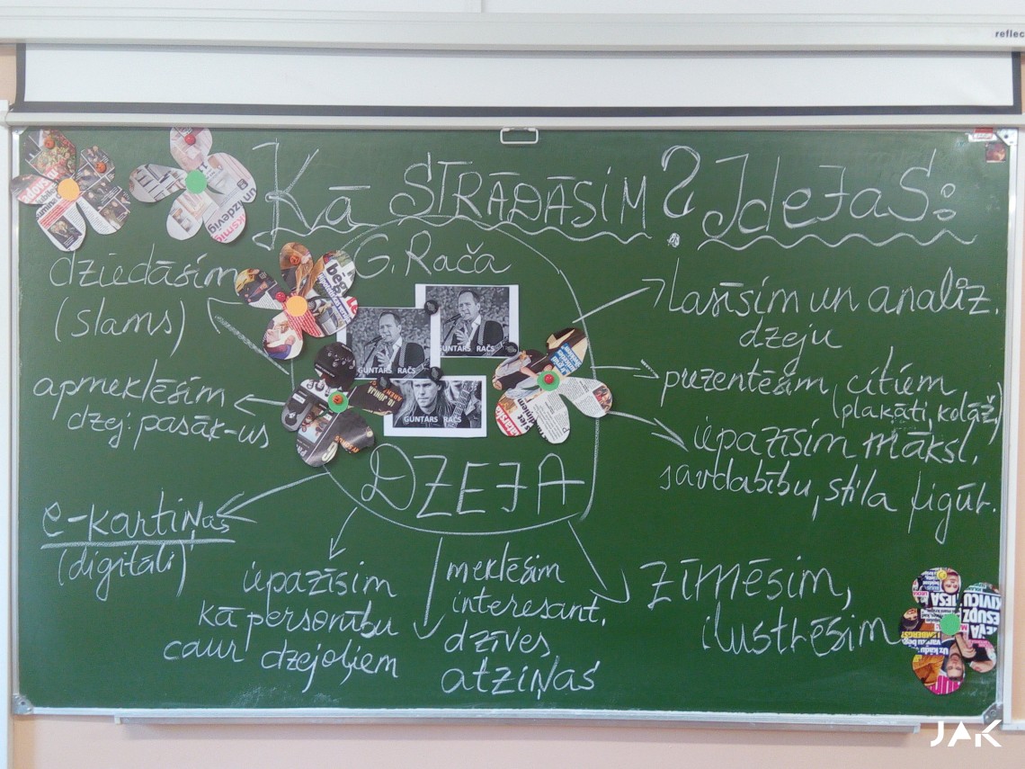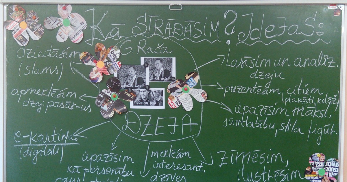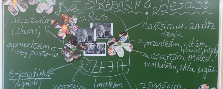 Mūsu skola izvēlējās mūziķi un dzejnieku GUNTARU RAČU, popularitāti guva jau 2017.gadā ar izdoto dzejoļu krājumu “365 dienas”1. & 2.daļu, kurā autors katrai dienai veltījis savu dzejoli. Nesen šim autoram tika izdots vēl viens dzejoļu krājums “Mīlestība ir”. Mēs izvēlējāmies viņu iepazīt tuvāk kā personību, kā dzejnieku nacionālā eTwinning projekta laikā. No augusta līdz novembra mēnesim mums bija jāveic ļoti dažādi uzdevumi – jāiepazīstina projekta partneri ar savu skolu- vizītkartes veidošana, skolēnu ideju ģenerēšana, dzejas akrostihs, dzejas slams, dzejas e-pastkartes, e-afišu veidošana digitāli, jāanalizē izvēlētā dzejnieka dzejoļu krājumi, plakātu, kolāžu veidošana, PowerPoint prezentāciju veidošana, dzejas atspoguļojums piktogrammās, simbolos 21. gs. rakstībā, dažādi sadarbības uzdevumi,ko atsūtīs partnerskolas, radoša darba veikšana – radošie dzejas pulksteņi, tikšanās ar dzejnieku un dzejas pasākumu apmeklējumu, labās prakses piemēru pieredzes apmaiņa literatūras stundām un citas aktivitātes, kura rezultātā taps kopīgi veidota e-grāmata.