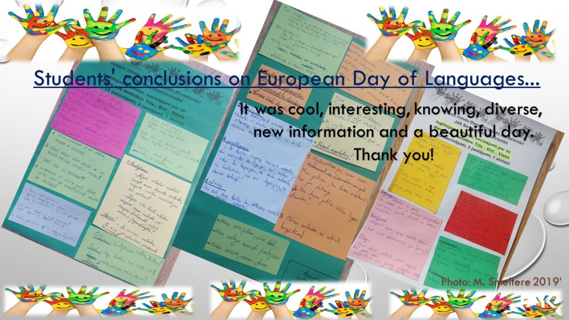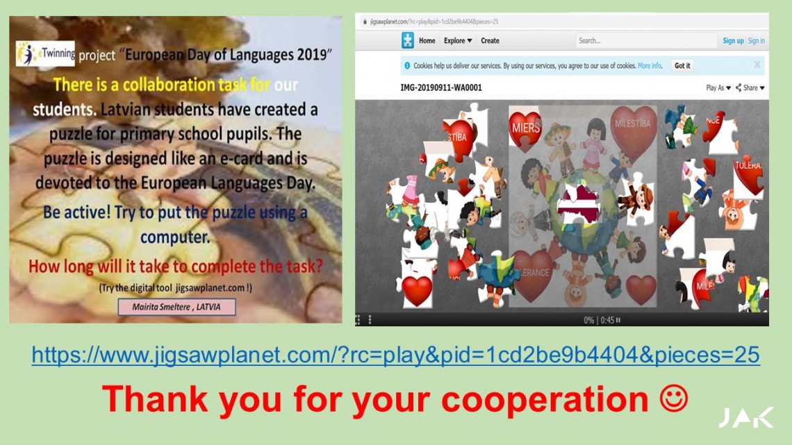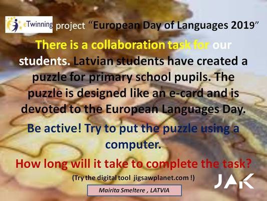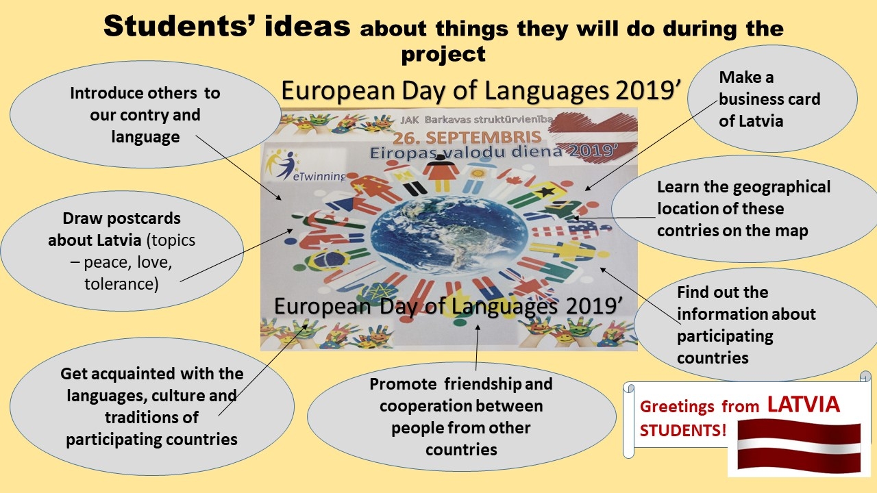 Šajā projektā piedalījās dažāda vecuma skolēni, sākot no sākumskolas līdz pat augstskolai. Skolēnu uzdevums bija radoši, vizuāli un digitāli veidot pastkartes, kuros redzami ierakstīti 3 atslēgvārdi savā dzimtajā valodā: miers, mīlestība un tolerance, kā arī rakstīja vēstules angļu valodā un pa pastu tās nosūtījām visiem projekta partneriem. Veidojām sadarbības uzdevumus arī starptautiskajiem partneriem, kā piemēram, piedalīties kahoot.com testā, lai viņi pārbaudītu savas zināšanas par valodu, kā arī sadarbojāmies ar Vangažu vidusskolu Latvijā, kurā vidusskolas jaunieši ar lielu prieku piedalījās mūsu erudīto jautājumu pārbaudē. Paldies par sadarbību Vangažu vidusskolas 10.klases angļu valodas skolotājai Ilonai Ušakevičai un eTwinning vēstniecei Solvitai Vencjunai. Tāpat arī iepriecinājām pašus mazākos un jaunākos projekta dalībniekus, kuriem mūsu skolas V1. kursa skolēns Ričards Vucāns sagatavoja e-puzli ar Eiropas valodas kartīti sākumskolas skolēniem, izmantojot digitālo rīku jigsawplanet.com.