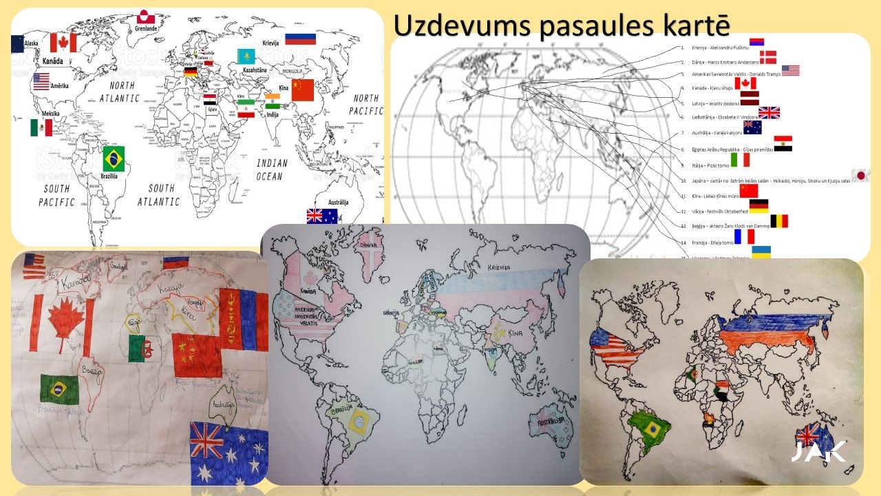 ·Darba lapā – Pasaules valstu karte (siluets) – jāatzīmē zināmās valstis, jāpiezīmē tās valsts karodziņš un jāpieraksta, ar ko saistās vai simbolizē tev šī valsts.