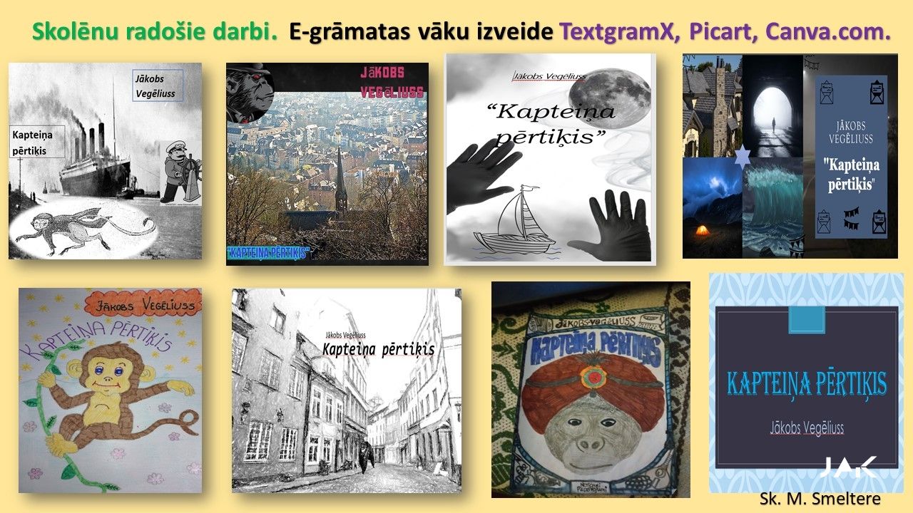 ·izmantojot digitālos rīkus veic radošu darbu TextgramX / Pictar / Canva... atbilstoši lasītajam tekstam veido grāmatas vākus.