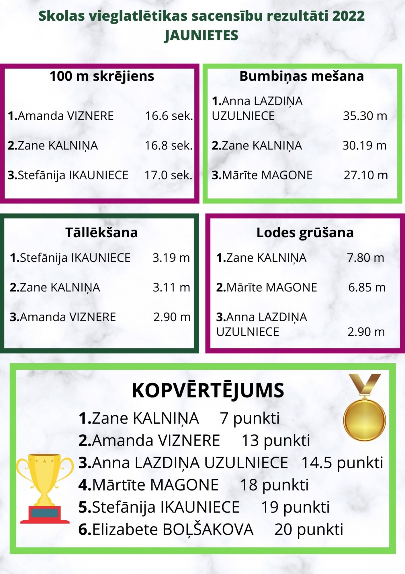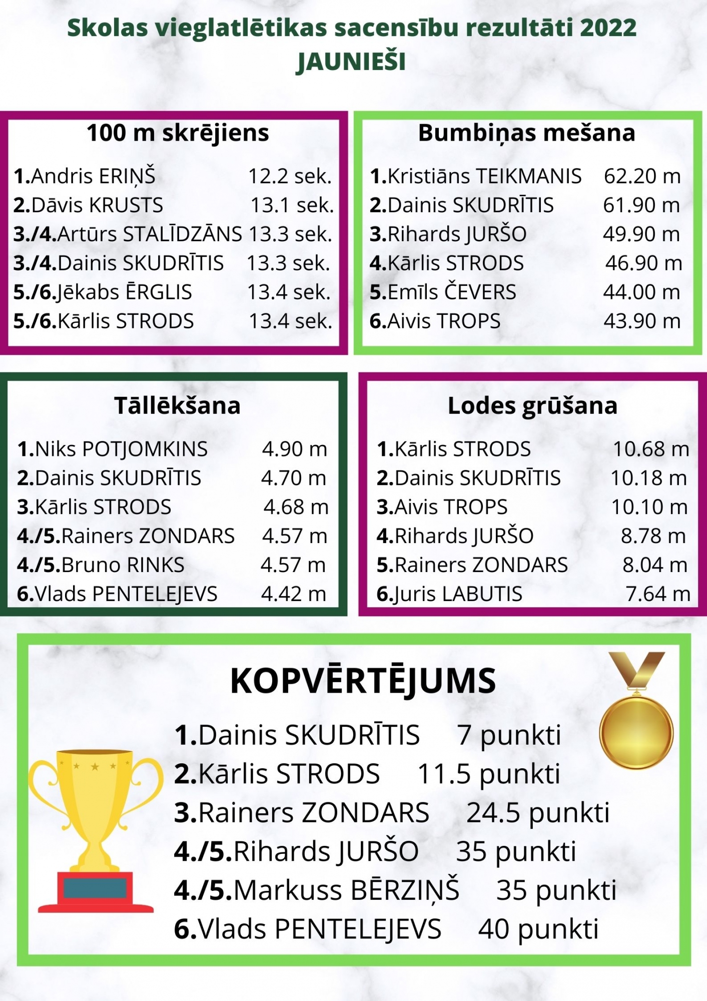 Labāko rezultātu apkopojums skolas sacensībās.