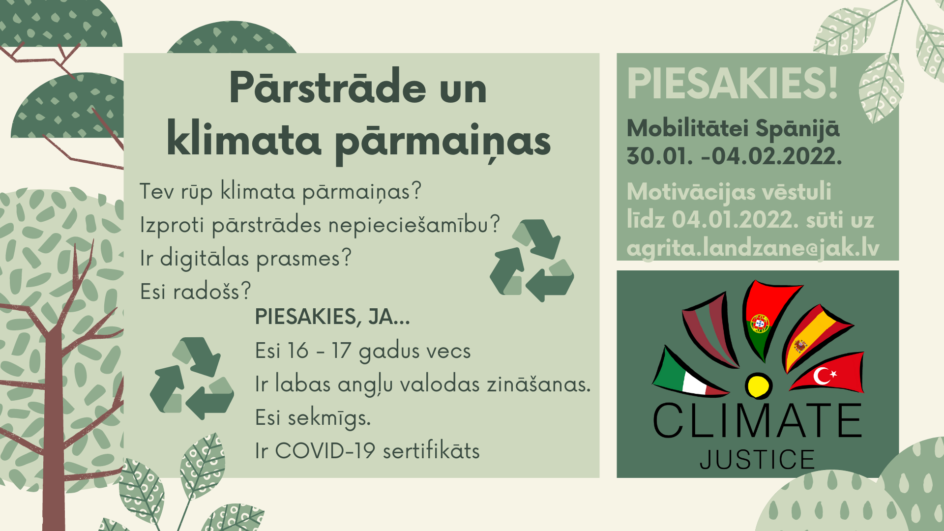 Ja esi 16 - 17 gadus vecs Jēkabpils Agrobiznesa koledžas Barkavas struktūrvienības audzēknis, Tev ir labas sekmes un angļu valodas zināšanas. Ja Tev rūp klimata pārmaiņas un izproti pārstrādes nepieciešamību - piesakies Erasmus+ skolu partnerības projekta "Climate Justice" mobilitātē "Pārstrāde un klimata pārmaiņas", kas norisināsies jau februārī Spānijā.