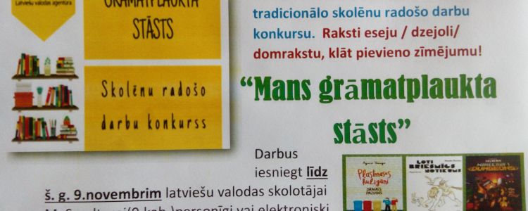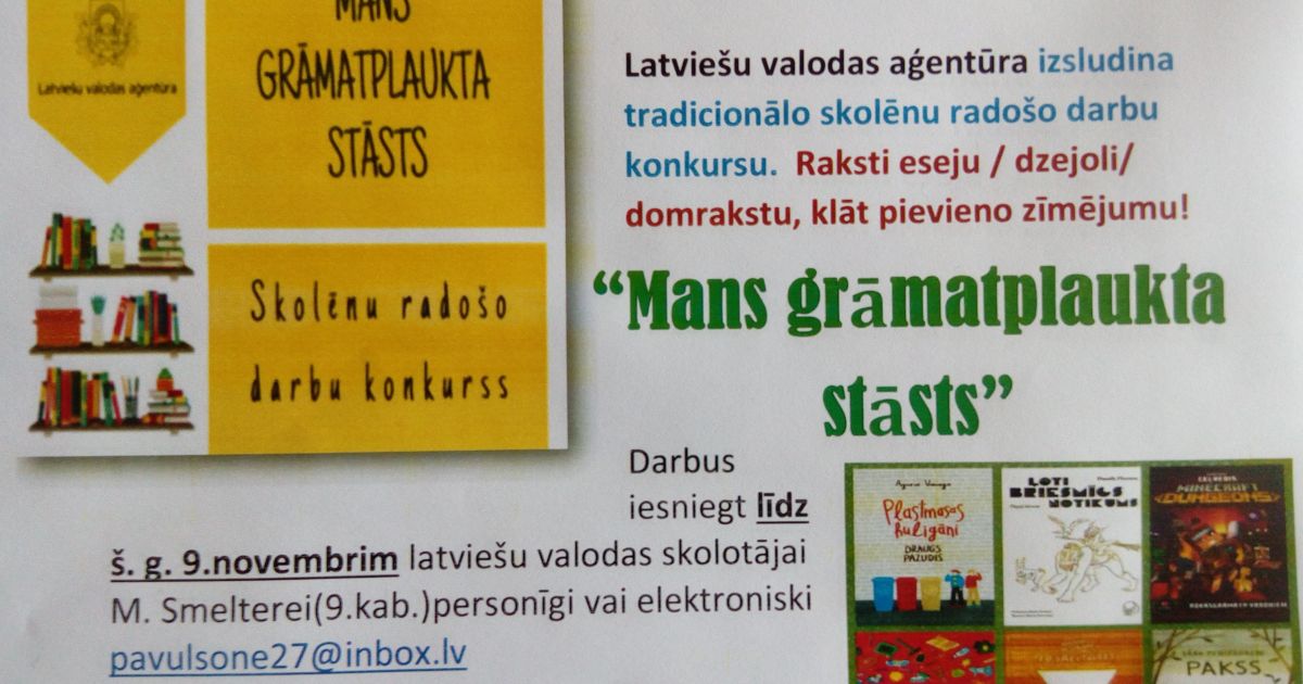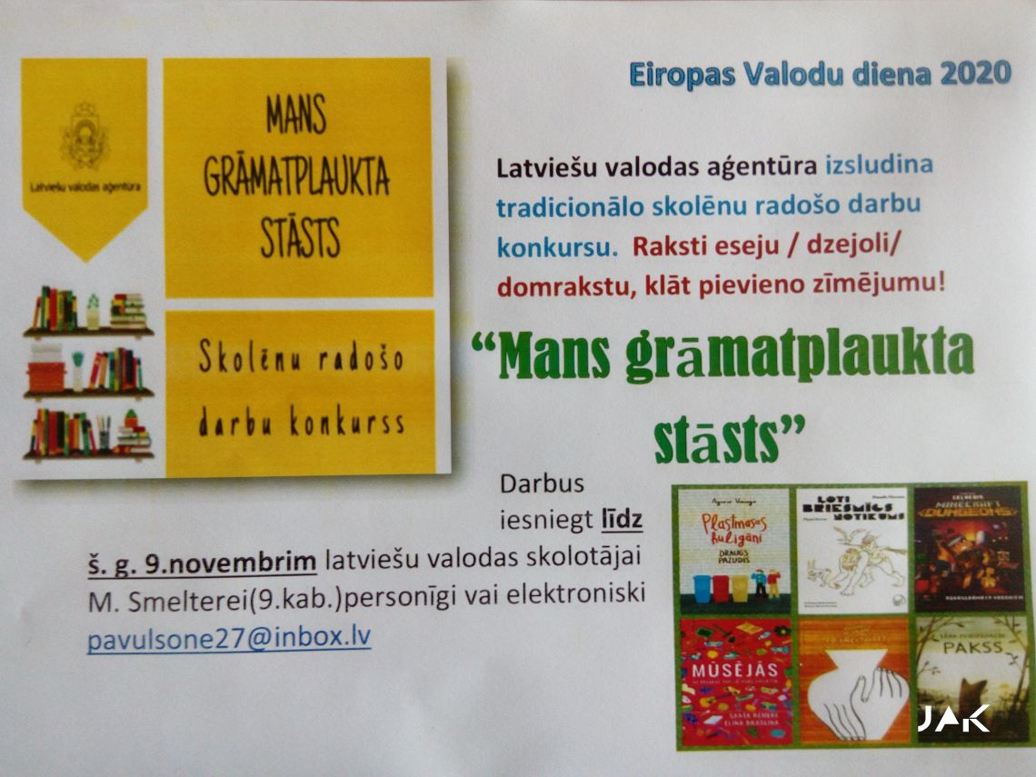 Eiropas Valodu diena 2020’ ietveros, Latviešu valodas aģentūra aicina skolēnus piedalīties konkursā “Mans grāmatplaukta stāsts”, rakstīt latviešu valodā domrakstus, esejas, dzejoļus, kā arī klāt pievienot zīmējumus un iesūtīt savus darbus.