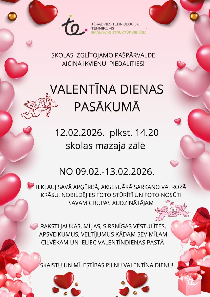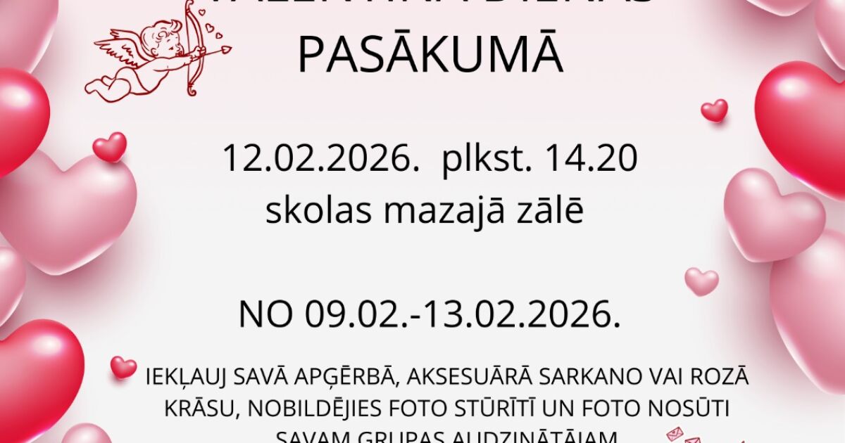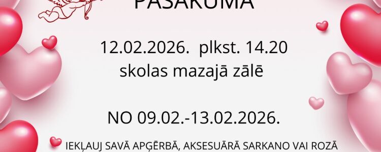 12.02.2026. plkst.14.20 skolas Mazajā zālē notiks Valentīndienai veltīts pasākums