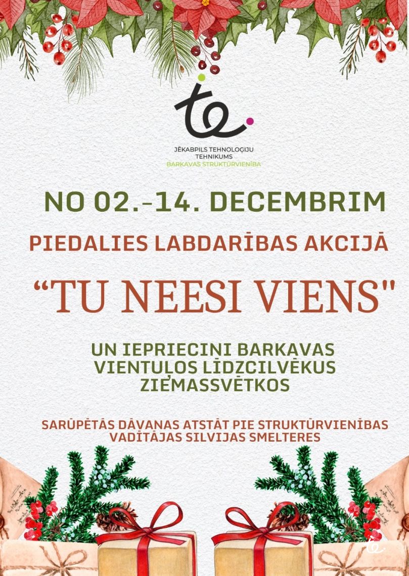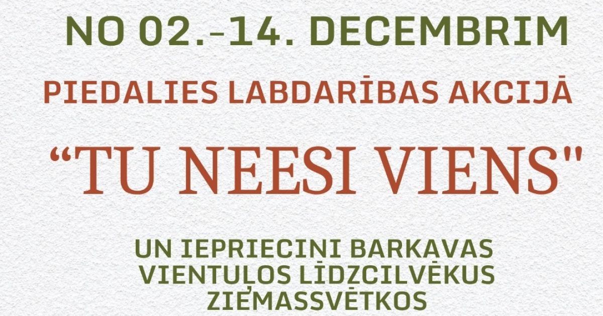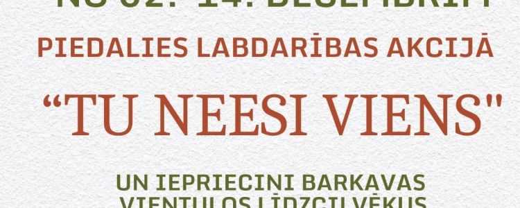 No 2.līdz 14.decembrim katram ir iespēja piedalīties labdarības akcijā "TU NEESI VIENS", kurā ir iespēja iepriecināt Barkavas vientuļos līdzcilvēkus Ziemassvētkos.
